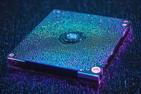 Close up of Computer Hard Drive Disc with abstract colors reflected on the disk surface. Background wallpaper.