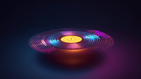 Vintage black vinyl long play record with colorful pellets. Creative disco party concept. Minimal background with neon blue and purple colored lights. Retro futurism.