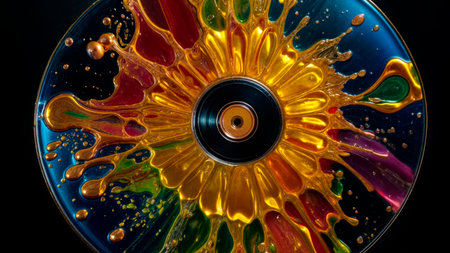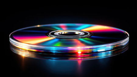 A vibrant optical disc displays an array of colorful reflections on a black surface, showcasing technology and media themes for creative projects.
