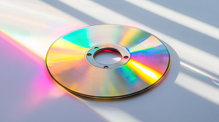 Single shiny CD casting vibrant rainbow reflections on a plain white background