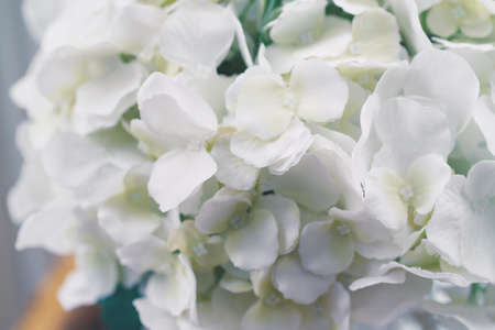Closeup macro still life of beautiful spring blooming white flowers hydrangea, artificial fake handmade