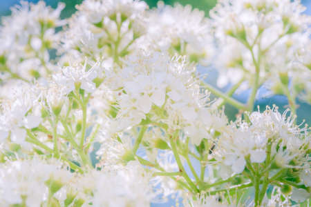 close-up photo of beautiful white flowers growing on a bush in the sun, with empty space for inserting advertising text. macro photography