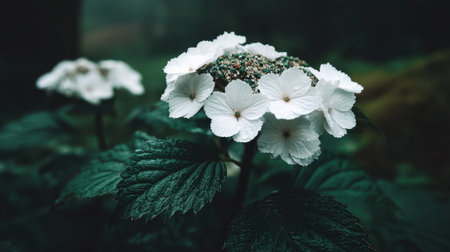 This image showcases a cluster of white wildflowers in a close-up shot. The petals contrast against the dark green foliage. The composition creates a moody aesthetic. Suitable for various projects including advertising, website design, and editorial content relating to nature, plants, or beauty.