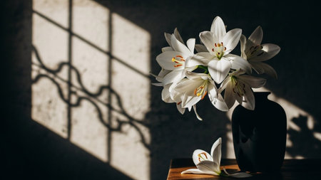 A cluster of white lilies in a dark vase sits on a wooden surface, with stark window grid shadows cast on a textured...