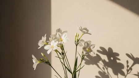 With showing delicate white flowers with soft sunlight and shadow play on a textured wall. resolution