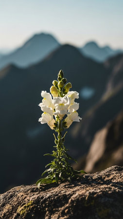 White snapdragon flower on the top of a rock with mountains in the background