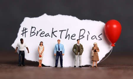 Torn paper with the word '#BreakTheBias' written on it. Break the bias campaign with miniature people.
