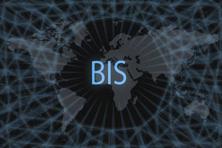 Bank for International Settlements BIS inscription on a dark background and a world map.