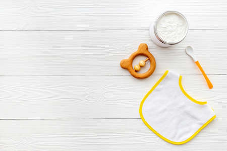 preparation of mixture baby feeding with infant formula powdered milk in bottle with bib on white desk background top view