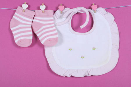 Baby girl nursery cute pink and white stripe socks and bib hanging from pegs on a line against a pink background for baby shower or newborn girl greeting card