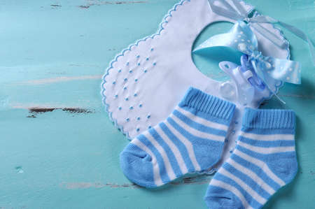 Baby boy nursery blue and white socks, bib and dummy pacifier, with copy space, on aqua vintage shabby chic background for baby shower or newborn girl greeting card