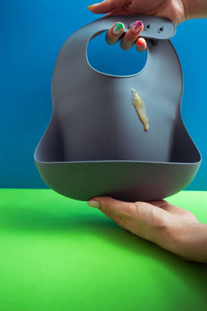 gray silicone bib with a drop of puree.Serving baby food.baby bib