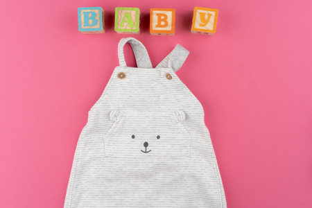 baby clothes on pink background top view