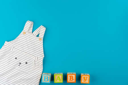 Top view of baby clothes on blue background