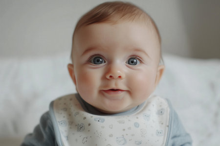 A baby with a milk-drunk face, half-smiling and eyes slightly squinty, wearing a simple bib