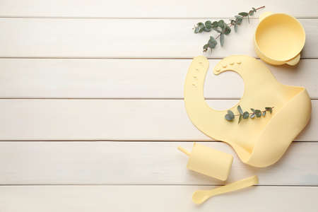 Flat lay composition with silicone baby bib and plastic dishware on white wooden background. Space for text