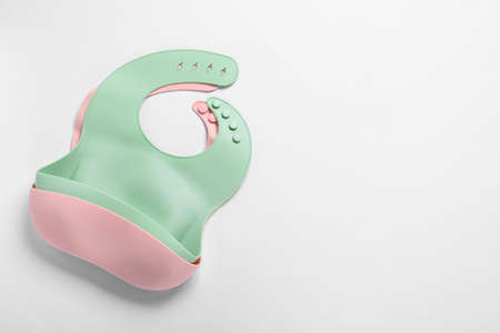 Color silicone baby bibs on white background, top view