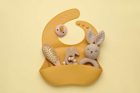 Baby accessories and bib on yellow background, flat lay