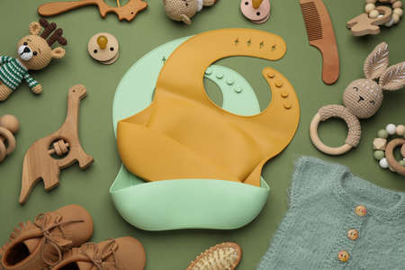 Flat lay composition with baby accessories and bibs on green background