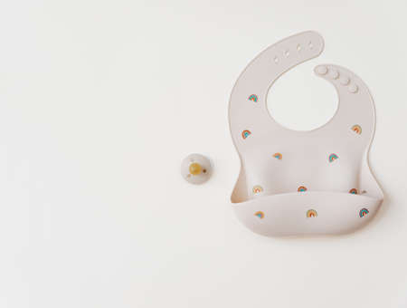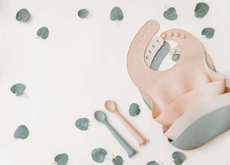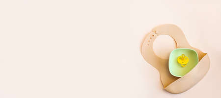 Silicone bib with on neutral background. Top view, flat lay, baby serving first food