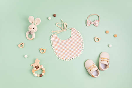 Baby shoes, bib and teether on pastel background. Organic newborn accessories
