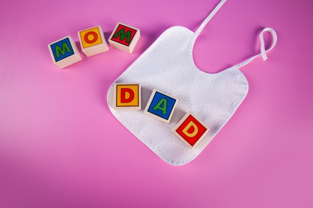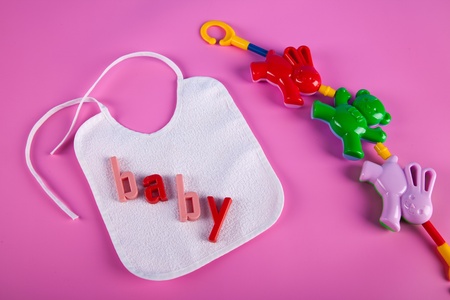 Silicone baby bib on pink pastel background