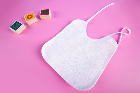 Close up of baby bib on white background. Clothing and accessories, newborn and infant childcare concept.