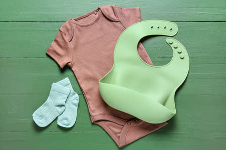 Baby clothes and bib on color wooden background