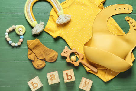 Composition with baby clothes, bib and toys on color wooden background, closeup