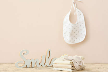 Light natural theme baby apparel top view flat lay. Mock up