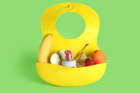 Bib with baby nibbler and fruits on color background