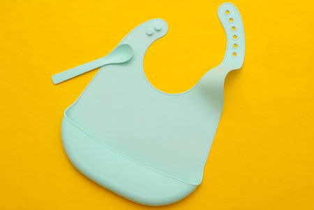 Silicone baby bib with spoon on yellow background. Accessories for feeding a small child