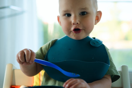 Young child successfully using spoon to eat separated broccoli and porridge. Important developmental step in learning self-feeding and food exploration.