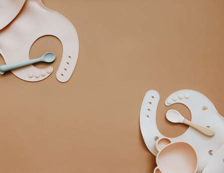 Baby accessories and tableware for food on beige background. First food for kids concept. Flat lay, Top View, Copy Space. Silicone plate, bib with on neutral background. baby serving.