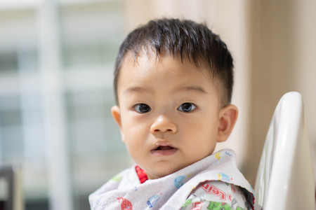 Portrait of staring baby boy in high chair