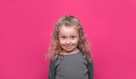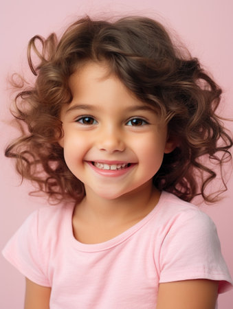 Portrait of a smiling little girl with curly hair on a pink background