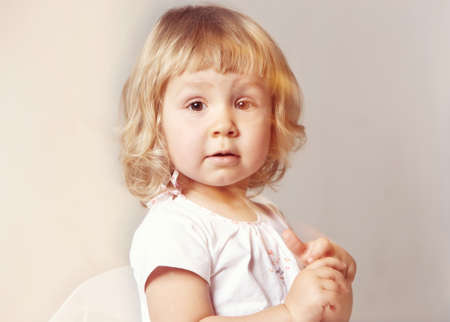 A three-year-old blonde girl looks worried ahead