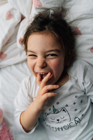 Top view of child girl on white bedding with plush toys. Positive emotions, cozy home.