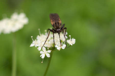 insect on white flowers close up in summer (Empis tesselata)