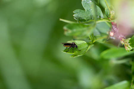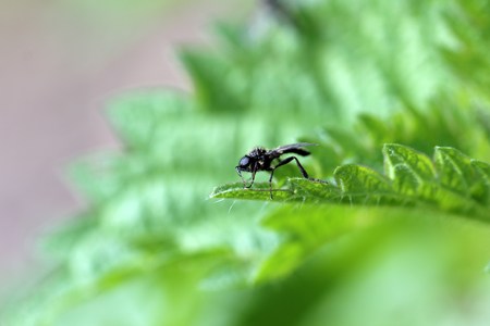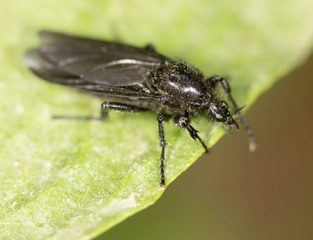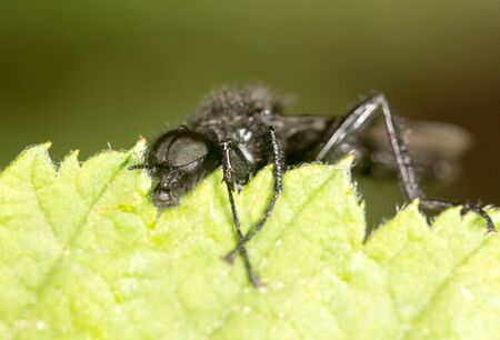 Black fly on green sheet close up, macro photo