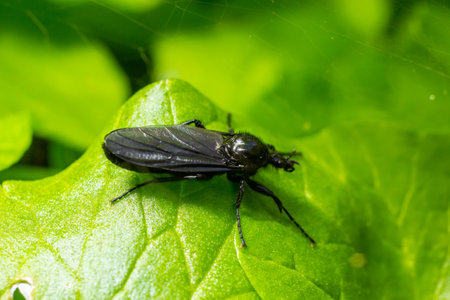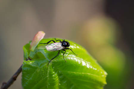 big black fly with wings eyes and legs on leaf outside in shade and leaves in light in spring
