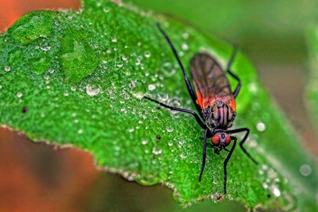 After a heavy rain shower, a wet fly sitting on a leaf