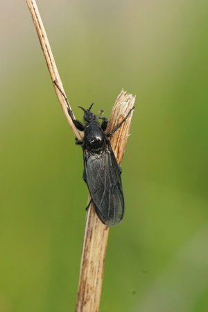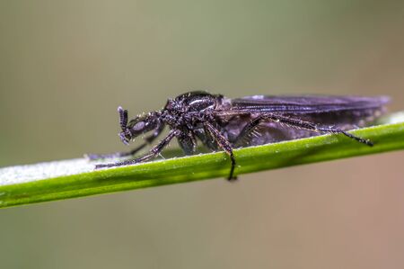Close-up of a dark-winged hair mosquito (dilophus febrilis) sitting on the tip of a flowering blade of grass in front of a green background
