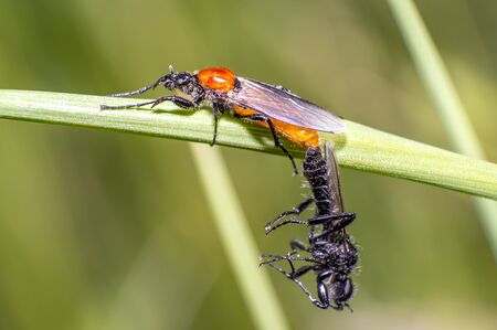 Bibio marci is a fly from the family Bibionidae called March flies and lovebugs. Larvae of this insects live in soil and damaged plant roots.