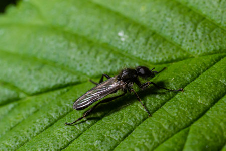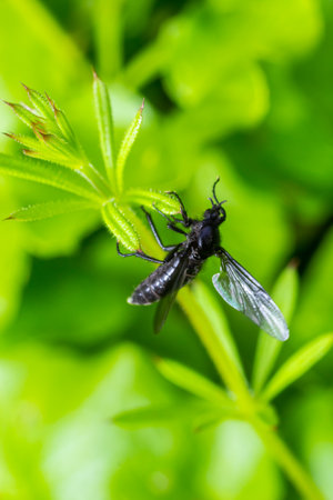 Adult Stilt-legged Fly on Green Leaf, Insect animal, macro photo.