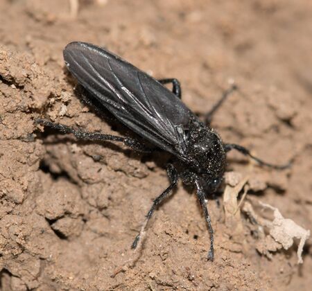 Bibio marci is a fly from the family Bibionidae called March flies and lovebugs. Larvae of this insect live in soil and damaged plant roots.