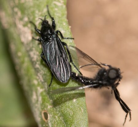 Close up view of a robber fly eating a small fly. Macro photography.