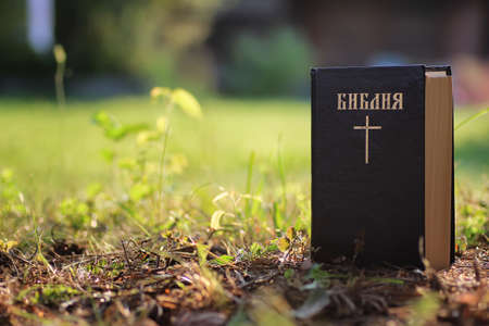 Bible in green grass. Reading the Holy Bible. Concept for faith, spirituality and religion.