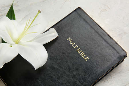 Holy Bible and flower on light background