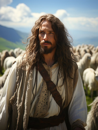 Jesus Christ herding sheep on green meadow in the mountains. AI